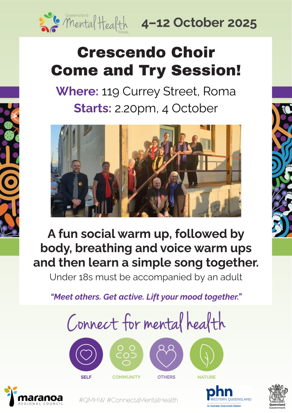 Visit WebsiteJoin the Crescendo Choir in Roma for a fun and social afternoon of music as part of Queensland Mental Health Week. The session will include body, breathing and voice warm-ups, followed by learning a simple song together. It’s a relaxed way to connect, lift your mood, and experience the joy of singing with others.