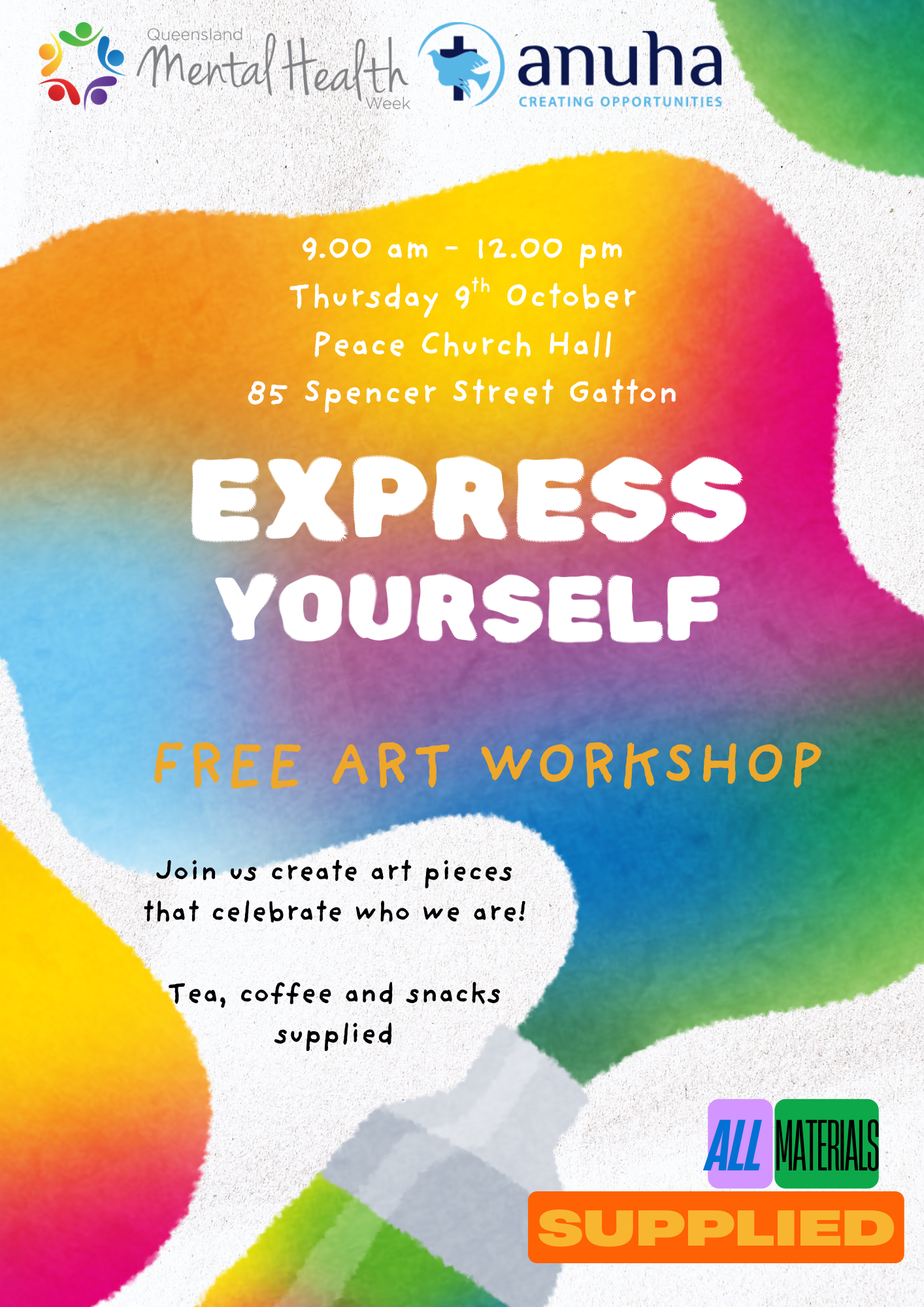 Express Yourself is a free all abilities art workshop targeted to older persons and people with a disability.  It will celebrate everyone’s unique ways to express their thoughts and feelings. All art materials and tuition will be supplied along with refreshments.