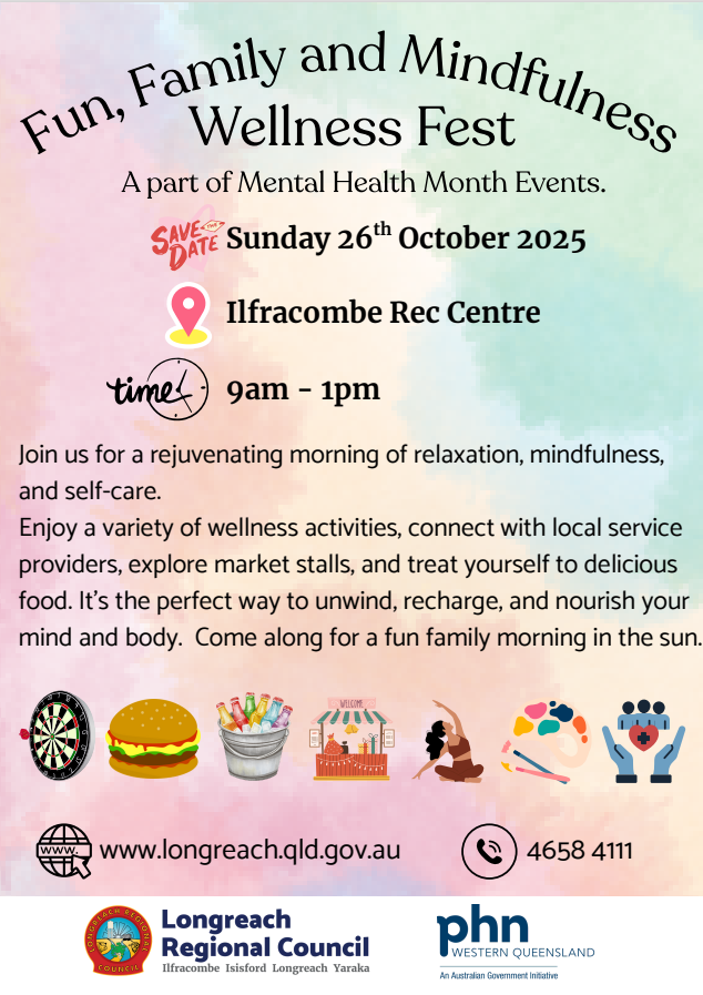 Visit WebsiteLongreach Regional Council, in partnership with Western Queensland PHN, invites the community to a special Wellness Fest on Sunday 26 October 2025. This family-friendly event is all about connection, relaxation and celebrating wellbeing as part of Mental Health Month.