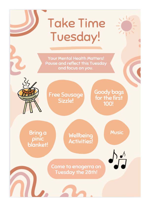 At Mt Maria College all students were invited to ‘Take Time Tuesday”!  This was a wonderful initiative that only occurred as a result of the generous grant obtained from the Queensland Government for the Queensland Mental Health week.  All students at Mt Maria College were invited to a delicious sausage sizzle at our 1st break and the first 100 were also able to pick up a goodie bag with loads of delicious treats.
