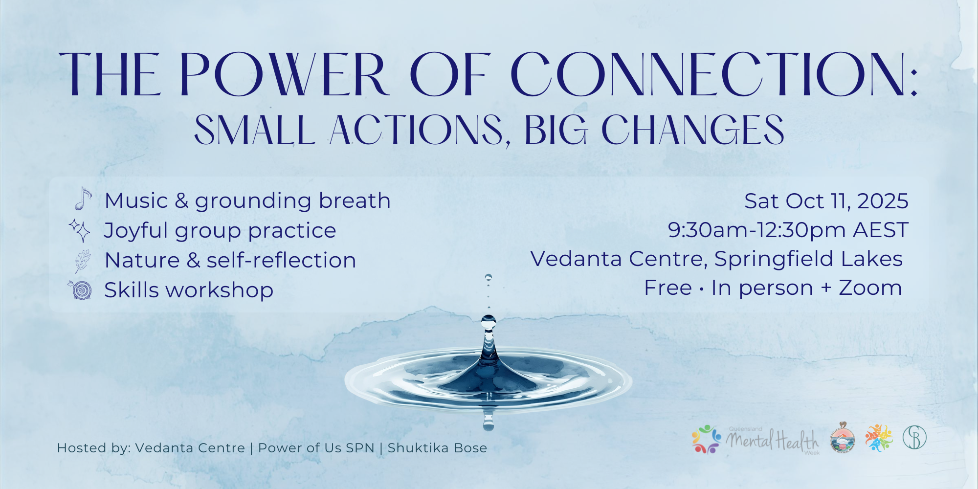 Join us for The Power of Connection, a free workshop during Queensland Mental Health Week, hosted by the Vedanta Society and the Power of Us Suicide Prevention Network, in collaboration with Clinical Psychologist Shuktika Bose.