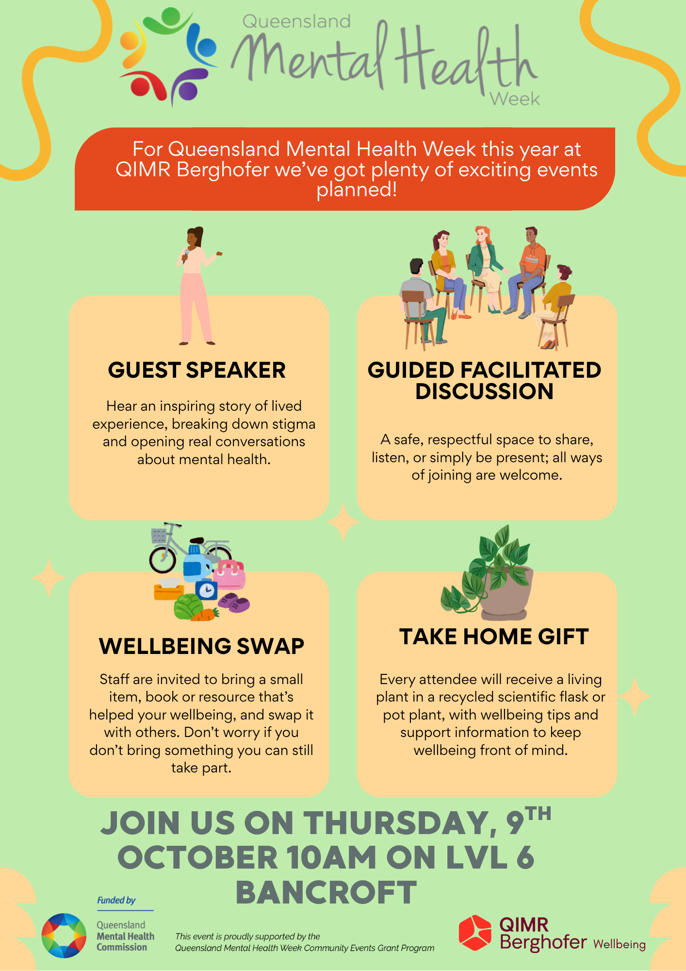 We’re hosting a “Wellbeing Swap & Yarning Morning” a private staff event that blends storytelling, cultural connection, and creativity in support of mental wellbeing. Staff are invited to bring along a small item, book or resource that’s helped their mental health, and swap it with others, creating a sense of shared experience and support. The morning will feature a respected guest speaker with lived experience, followed by a guided yarning circle that encourages open discussion in a culturally respectful space. To honour our identity as a medical research institute, each attendee will take home a living plant potted in a recycled scientific flask. Attached to each plant will be a tag with a wellbeing tip, support service info, and a QR code linking to our intranet mental health hub. Light refreshments and quiet areas will be available to ensure the event is inclusive and accessible.