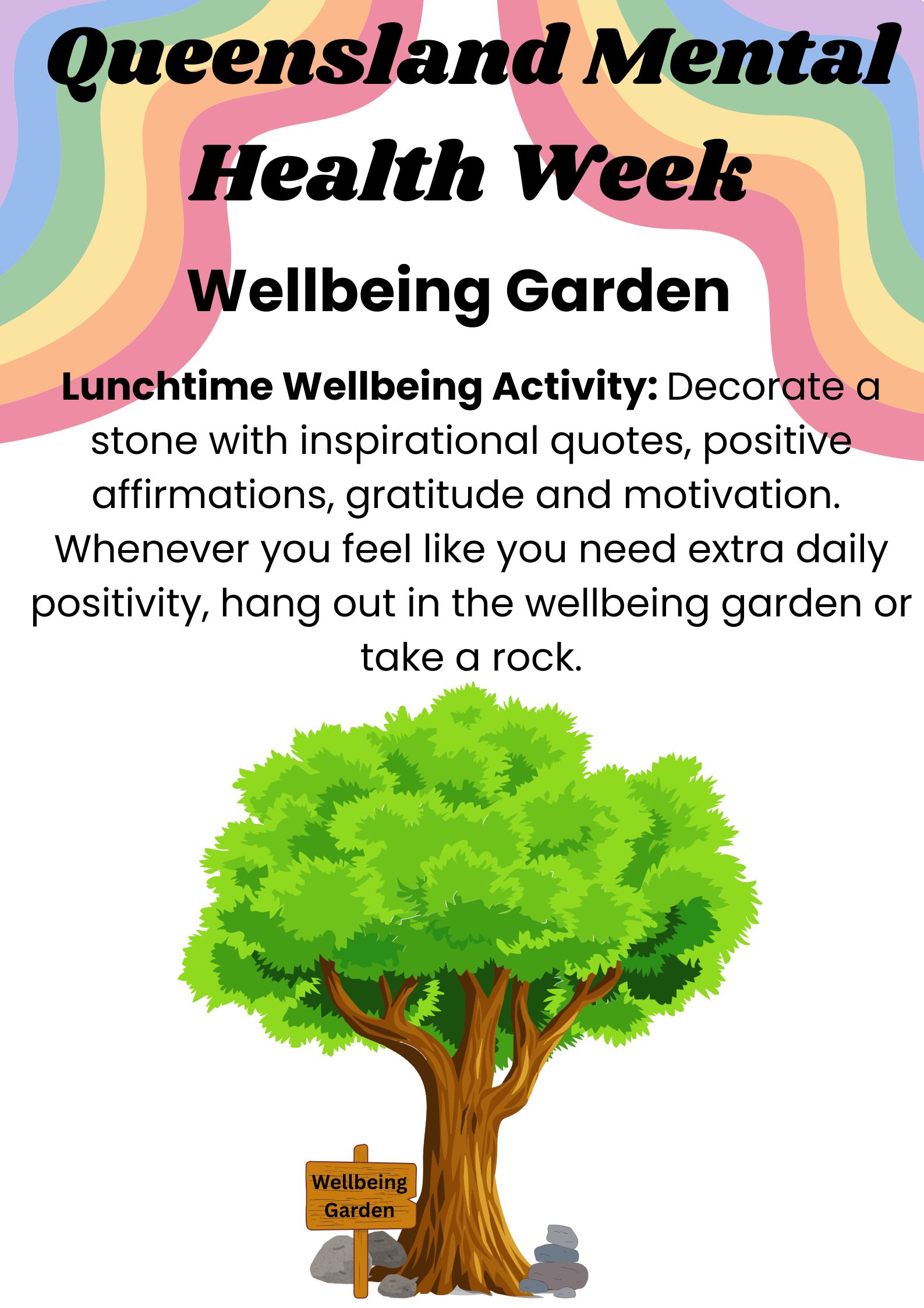 Students at our school will be offered the opportunity to decorate a stone with words of affirmation, kindness, gratitude, motivation, or inspiration. These decorated stones will be placed under a designated Kindness Tree, thereby creating a Wellbeing Garden. Students will have the opportunity to take stones from this garden whenever they require encouragement or motivation for the day. Additionally, they may participate in ongoing lunchtime craft activities to paint new stones or return the ones they previously borrowed. The kindness garden encourages students’ interaction and friendship building, promoting student wellbeing and mental health.