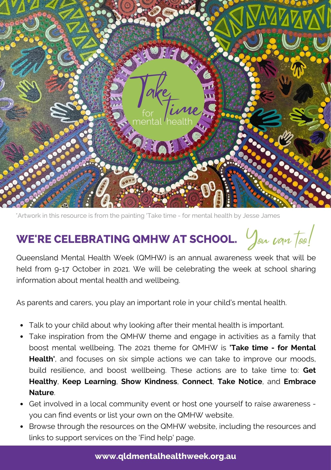 • Participate in the ‘Take time – for mental health’ social media challenge by sharing a photo on Instagram showcasing how your school community takes time for mental health using #QMHWTakeTime and @qldmentalhealthweek between 4 September and 17 October 2021.